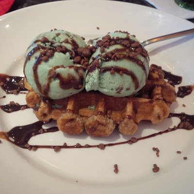 The dessert was definitely my highlight of the meal. The waffle was warm and flavoured with cinnamon, topped with mint chocolate chip ice cream, warm chocolate fudge sauce and chocolate honeycomb. The ice cream was good quality ice cream... I know good quality ice cream when I taste it, believe me. Although the chocolate fudge sauce was very rich, it had been used sparingly so that it didn't overpower the rest of the dessert. The chocolate honeycomb pieces were really tasty too and worked well with the mint choc chip ice cream. I would probably have chosen vanilla ice cream for this dessert if I had a choice, but the mint choc chip really works. Massive round of applause for the dessert!